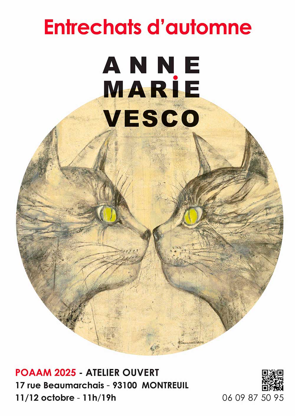 Atelier : 17-23, rue Beaumarchais - 93100 Montreuil Anne-Marie Vesco ouvre son local pour les portes ouvertes des ateliers d'artistes à Montreuil → télécharger l'invitation • exposition du vendredi 13 au lundi 16 octobre de 14h à 20h • vernissage le vendredi 13 octobre de 18h à 22h30 |